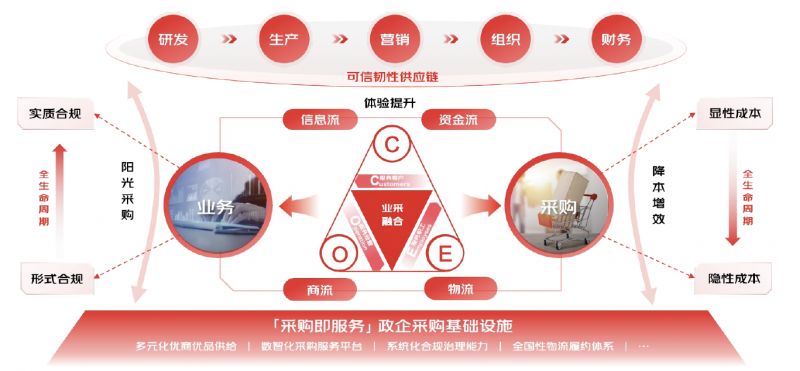 業(yè)采融合的核心,在于打破采購(gòu)與業(yè)務(wù)之間傳統(tǒng)的職能邊界、打破采購(gòu)體系的外部邊界,推進(jìn)政企采購(gòu)信息流、商流、物流、資金流“四流合一”,實(shí)現(xiàn)采購(gòu)與研發(fā)、生產(chǎn)、營(yíng)銷、組織、財(cái)務(wù)的“五大融合”,最終通過(guò)與采購(gòu)部門的全面協(xié)同形成業(yè)采融合,加速破解政企采購(gòu)“價(jià)格、質(zhì)量、效率”不可能三角,全面向“成本、效率、體驗(yàn)”的黃金三角轉(zhuǎn)型。