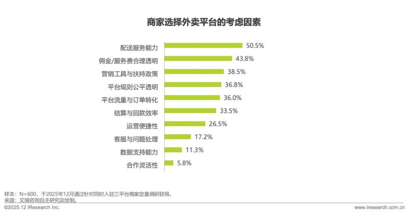 與此同時,商家選擇平臺的核心邏輯也轉(zhuǎn)向價值維度,調(diào)研顯示,“配送服務(wù)能力”以50.5%超半數(shù)居于高位,其次是“傭金/服務(wù)費(fèi)合理透明”(43.8%)、“營銷工具與扶持政策”(38.5%)。反映出行業(yè)正從成本導(dǎo)向邁向效率與價值導(dǎo)向。