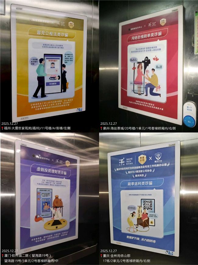 本次上線的分眾電梯媒體,廣泛分布于福州、泉州、廈門及重慶等多地的小區(qū)、寫字樓等場所,精準(zhǔn)輻射不同年齡段、不同職業(yè)的居民群體——無論是上下班通勤的上班族、采購出行的家庭主婦,還是接送孩童的老年群體,都能在日常出行中自然接觸到反詐海報。這種“嵌入生活場景”的宣傳方式,避免了傳統(tǒng)宣傳“廣撒網(wǎng)”的低效率問題,讓反詐知識精準(zhǔn)觸達(dá)每一個可能遭遇詐騙風(fēng)險的家庭,尤其針對老年群體、新市民等易受騙人群形成重點覆蓋,有效彌補了以往宣傳的盲區(qū)與短板。