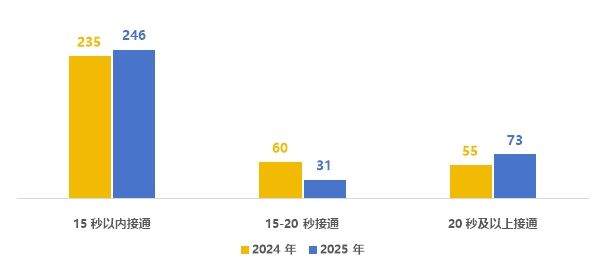 從接通時長來看,熱線平均接通時長在15秒以內(nèi)的城市有246個,較2024年增加11個,但平均接通時長在20秒及以上接通的城市也有所增加,較2024年增加18個。其中,廣東珠海、云南昆明、江蘇南通、四川瀘州、河南濮陽等57個城市平均5秒內(nèi)接通。