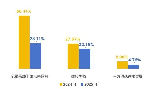 從轉(zhuǎn)接轉(zhuǎn)派處置情況來看,第三方通話成功率、轉(zhuǎn)接成功率及形成工單后部門回復(fù)率均較2024年有進步,但仍待提升。除話務(wù)員直接回復(fù)的情況外,在所有形成工單并轉(zhuǎn)派的場景中,有28.11%未進行回復(fù);在所有轉(zhuǎn)接至相關(guān)部門進行解答的場景中,有22.16%未接通;在所有第三方通話場景中,有4.76%未能接通。