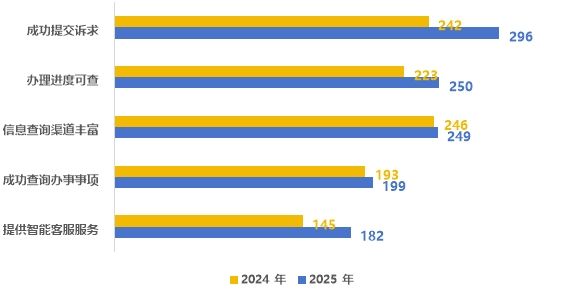 2025年12345熱線線上端測評聚焦微信公眾號、APP等移動端,測評結(jié)果顯示線上端多項指標表現(xiàn)較2024年有所進步。從訴求提交與查詢方面來看,296個城市可以提交訴求(同比增長22.31%),其中250個城市可以查看訴求辦理進度(同比增長12.11%)。