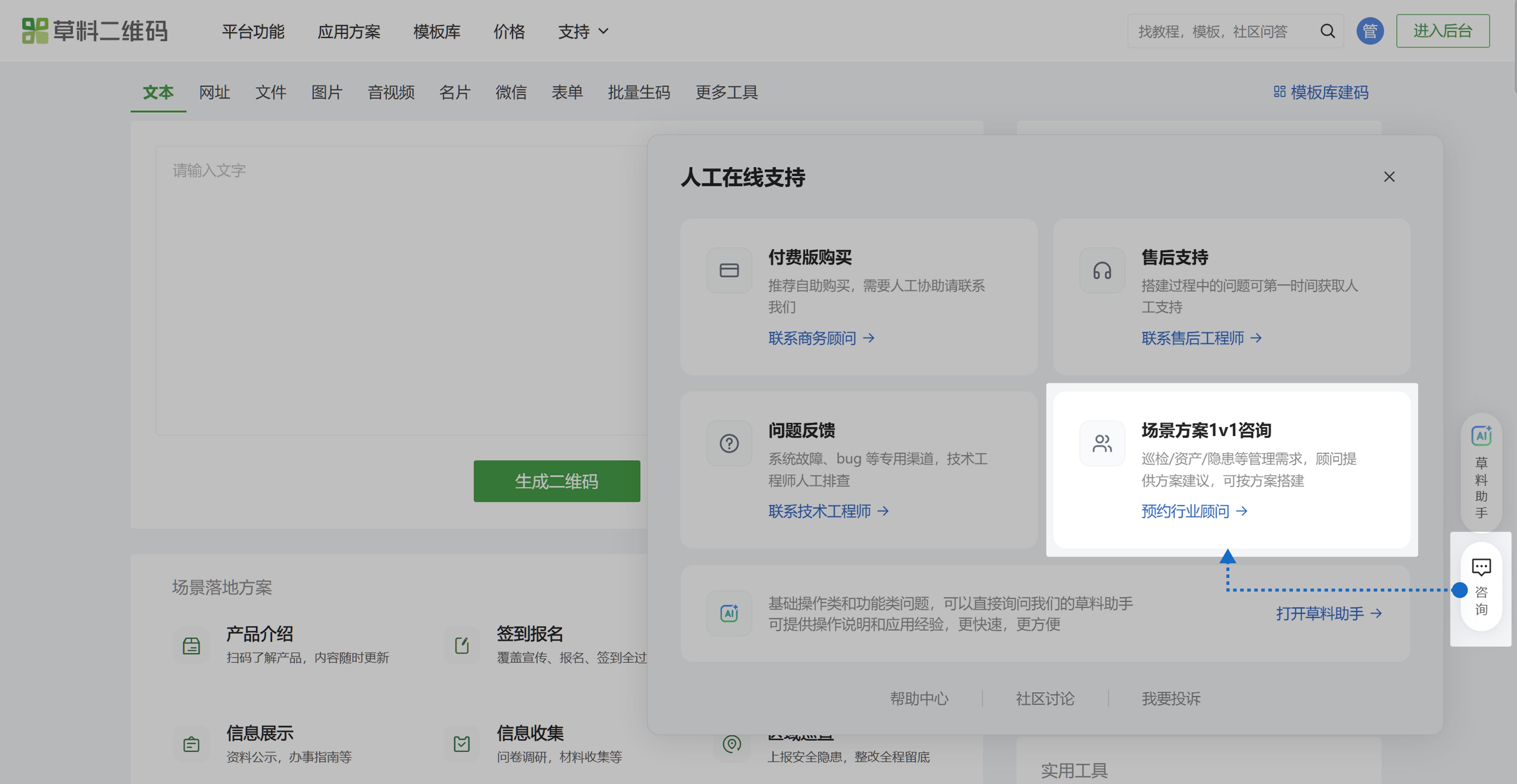 如需深入了解或獲取落地協(xié)助,請(qǐng)?jiān)陔娔X端的“草料二維碼”官網(wǎng),在任意頁(yè)面右下方點(diǎn)擊【咨詢】-【場(chǎng)景方案1v1咨詢】,草料技術(shù)顧問(wèn)將為你提供以下服務(wù):