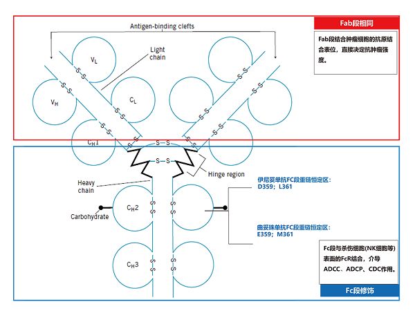 伊尼妥單抗(賽普汀?)是一種重組人源化的單克隆抗體,F(xiàn)ab段與曲妥珠單抗一致。通過Fc段修飾(伊尼妥單抗Fc段重鏈恒定區(qū):D359;L361,曲妥珠單抗Fc段重鏈恒定區(qū):E359;M361)和生產(chǎn)工藝優(yōu)化,伊尼妥單抗具有更強的抗體依賴的細胞介導的細胞毒效應(ADCC)。伊尼妥單抗既可以阻斷HER2通路直接抑制腫瘤細胞增殖和生長,又可以誘導ADCC效應使機體免疫系統(tǒng)識別和殺傷腫瘤細胞。
