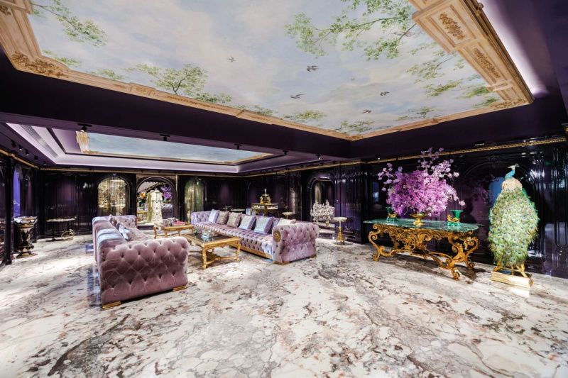 琉璃紫,融琉璃的通透夢(mèng)幻,與紫氣東來的美好寓意,在一層接待區(qū)大面積應(yīng)用造境,與花園主題的壁畫、天空,共同筑就唯美爛漫、春意盎然的意蘊(yùn),一步一景間都是開啟「高級(jí)定制」的致美儀式。