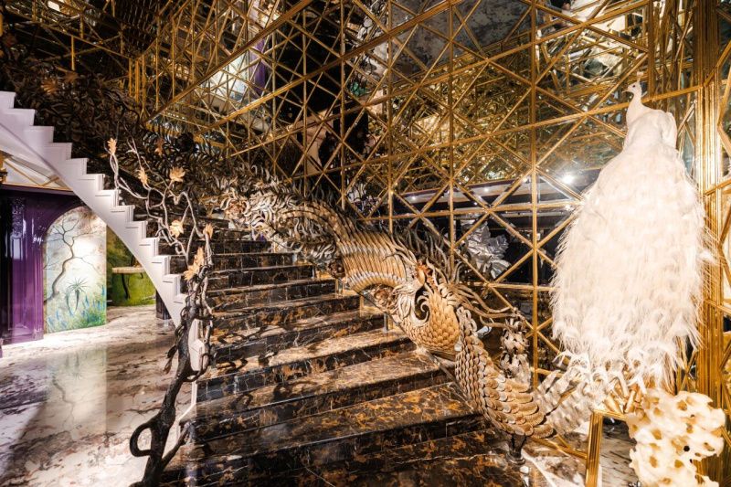 一層接待區(qū)是客人走進(jìn)北京玫瑰坊的第一印象,不只要“奢華”,更要傳遞出東方的莊重與底蘊(yùn)。郭培老師一直想找一種材質(zhì),不僅能奠定空間的基調(diào),也能承載東方美學(xué)的靈魂;既要有故宮琉璃瓦般的溫潤(rùn)與力量,又要有如金繡技藝中那種“于細(xì)節(jié)處見乾坤”的匠心精神。