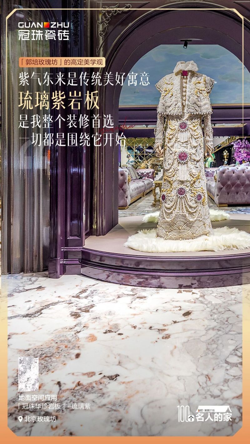 “冠珠華珍巖板琉璃紫,正是這樣一種存在。第一次見到它,我就被那種深邃流動(dòng)的紋理打動(dòng),它并非簡(jiǎn)單的復(fù)刻傳統(tǒng),而是對(duì)東方意境的當(dāng)代轉(zhuǎn)移,從上海工作室到北京玫瑰坊,我始終選擇它,是因?yàn)檎嬲吭降牟馁|(zhì),不僅要配得上任何傳世華服,更要經(jīng)得起高定的標(biāo)準(zhǔn)下,對(duì)極致之美的苛刻審視?!惫嗬蠋煙崆榈胤窒砹私哟齾^(qū)的美學(xué)構(gòu)思。