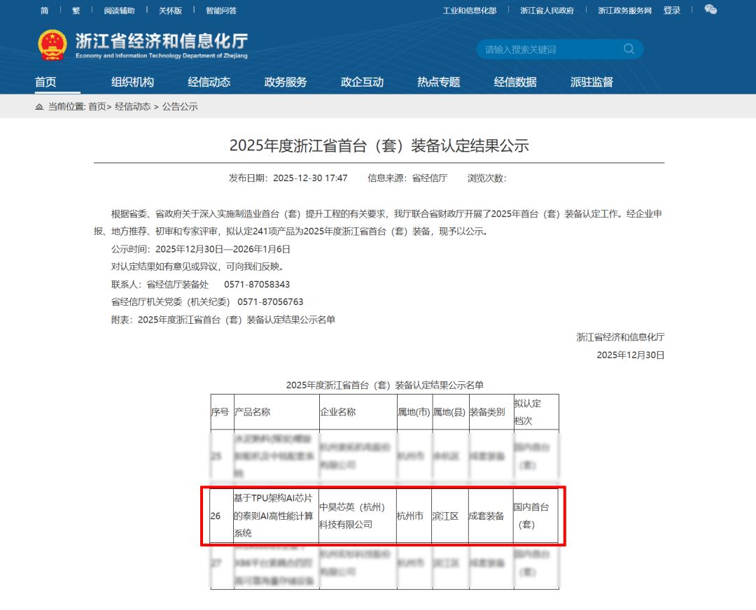 近日,浙江省經(jīng)濟和信息化廳正式發(fā)布2025年度浙江省首臺(套)裝備認定結(jié)果,中昊芯英(杭州)科技有限公司(以下簡稱“中昊芯英”)自主研發(fā)的、搭載自研TPUAI專用算力芯片的“泰則AI高性能計算系統(tǒng)”,憑借領(lǐng)先的技術(shù)創(chuàng)新與行業(yè)應(yīng)用價值,成功入選“國內(nèi)首臺(套)裝備”名單,標志著公司在AI算力核心裝備領(lǐng)域的研發(fā)實力與技術(shù)突破獲得權(quán)威認可。