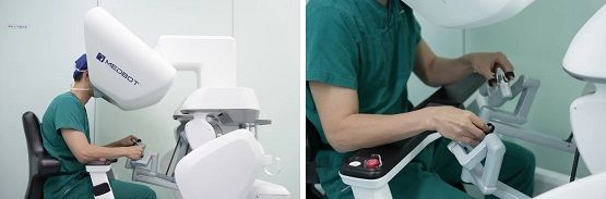 與傳統(tǒng)手術(shù)不同的是,竇若虛主任并未站立于患者身側(cè),而是坐在一旁的控制臺前,通過操控手柄、腳踏板操控手術(shù)機器人進(jìn)行手術(shù)。