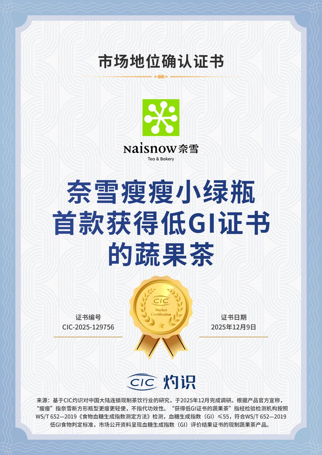 CIC灼識在中國連鎖現(xiàn)制茶飲行業(yè)有長期豐富的研究經(jīng)驗,在2025年12月期間,CIC灼識采用科學(xué)、嚴(yán)謹(jǐn)?shù)慕y(tǒng)計與分析方法,對中國連鎖現(xiàn)制茶飲行業(yè)開展了深度調(diào)研和專項的系統(tǒng)性研究?;趯χ袊B鎖現(xiàn)制茶飲行業(yè)的競爭格局、產(chǎn)品類型等方面的詳盡調(diào)研與深度分析,CIC灼識確認(rèn),奈雪的茶“奈雪瘦瘦小綠瓶,首款獲得低GI證書的蔬果茶”的市場地位。