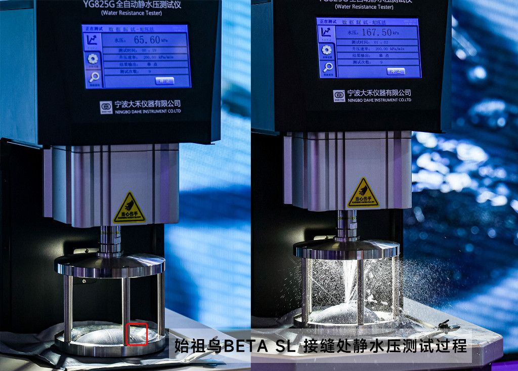 始祖鳥BETA SL接縫處靜水壓測試中,水壓在65.60kPa左右出現(xiàn)小水珠,76kPa左右面料部分出現(xiàn)水柱漏水,最終在167.50kPa膠條接縫處漏水