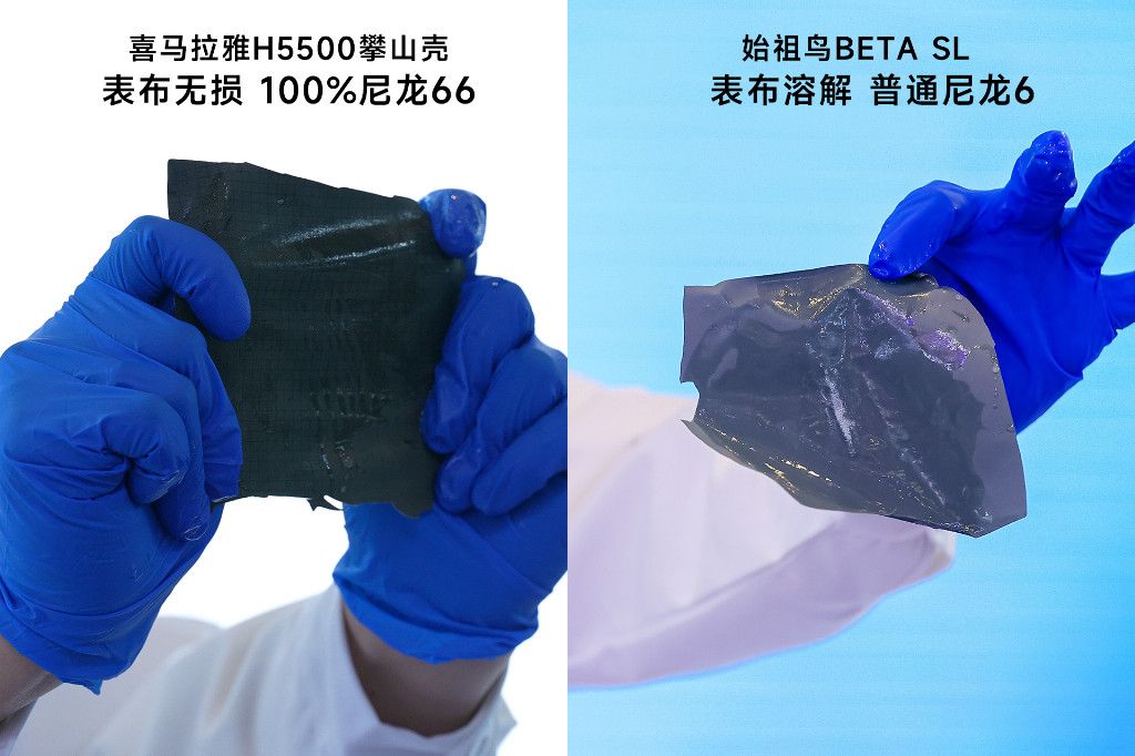 材料的“耐久革命”: 在15%鹽酸溶解實(shí)驗(yàn)中,搭載pk-tex? 巔峰面料的喜馬拉雅H5500攀山殼表層尼龍面料未被腐蝕溶解,確認(rèn)為100%尼龍66材料,比常規(guī)的尼龍6材料抗磨損、抗撕裂性能高出20%,為專業(yè)攀登者帶來極致防護(hù)。而在同樣的測試中,始祖鳥BETA SL表層尼龍面料被15%稀鹽酸溶解腐蝕,露出內(nèi)部白膜,為普通尼龍6面料。