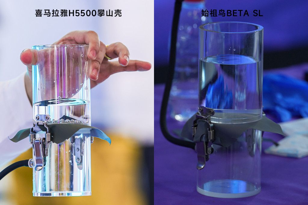 H5500攀山殼中間層采用pk-tex?巔峰面料的ePE環(huán)保膜,在現(xiàn)場測試中可以看到,其中間層防水透濕膜采用單組份改性ePE膜,透氣儀器中可見氣泡從微孔結(jié)構(gòu)中逸出。據(jù)悉,此款ePE環(huán)保膜具備直透能力,可實(shí)現(xiàn)雙透氣/汽,氣態(tài)汗水與液態(tài)汗汽從微孔結(jié)構(gòu)中排向外界,提升高強(qiáng)度運(yùn)動(dòng)下的體感舒適度,為高海拔攀登筑起一道防失溫的安全屏障。而采用GORE-TEX雙組份ePE膜的始祖鳥BETA SL,并未見氣泡從微孔結(jié)構(gòu)中逸出。