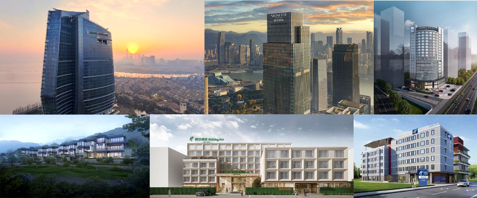 上排從左至右:湖州南太湖洲際酒店、洲至奢選重慶TFT酒店、合肥中心尚都筑格酒店