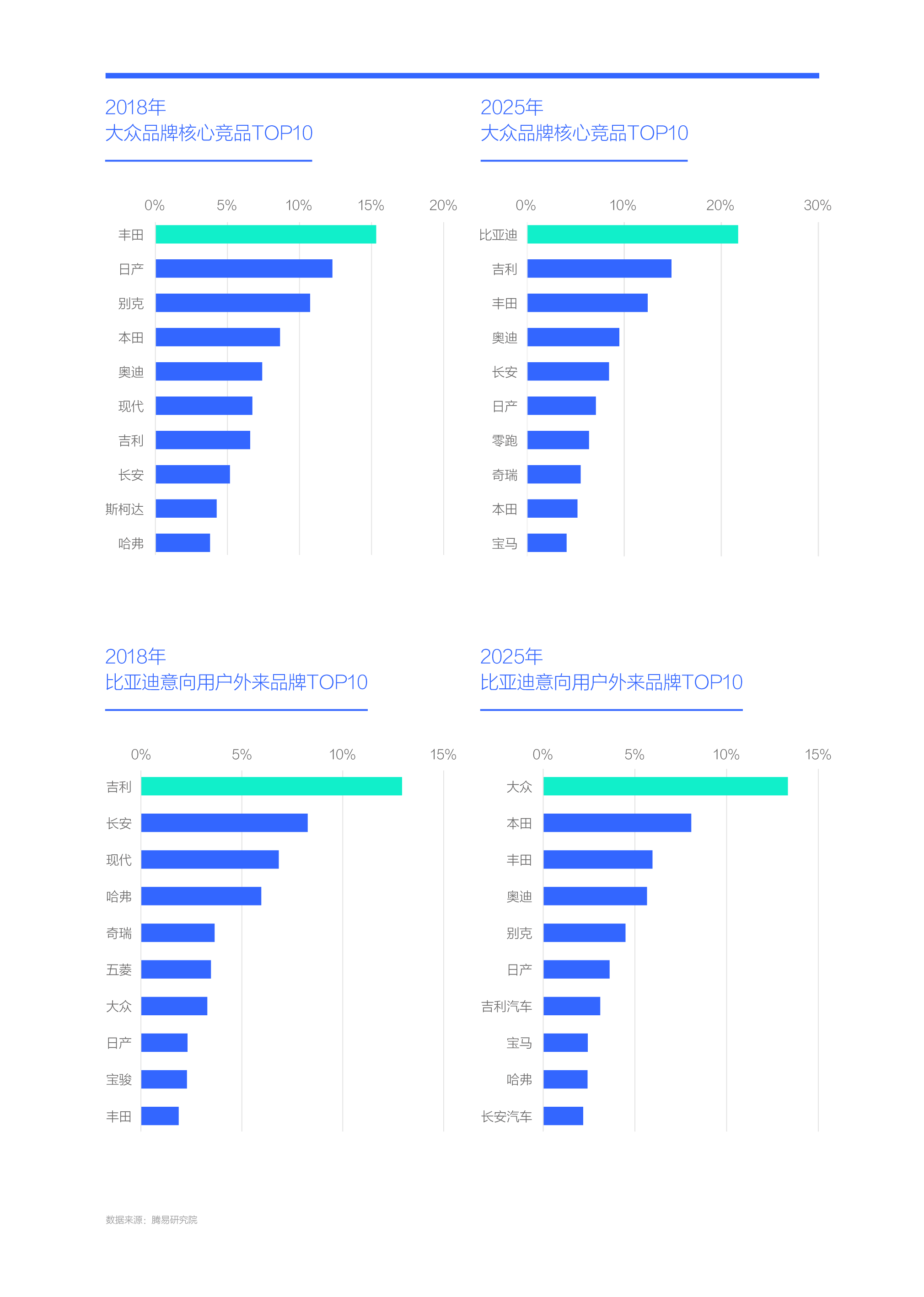 在小電動(dòng)未強(qiáng)勢(shì)崛起之前,海外品牌幾乎不帶中國(guó)品牌玩,兩大陣營(yíng)各玩各的。2018年大眾的最大競(jìng)品為豐田,其次是日產(chǎn)、別克、本田和奧迪,TOP5全為海外品牌。中國(guó)品牌很難向海外品牌滲透,2018年比亞迪的意向用戶外來(lái)品牌最多的是吉利,其次是長(zhǎng)安,第三雖是現(xiàn)代,但第四、第五和第六分別為哈弗、奇瑞和五菱,都是中國(guó)品牌。2020年起,隨著中國(guó)品牌小電動(dòng)的強(qiáng)勢(shì)崛起,海外品牌的傳統(tǒng)競(jìng)爭(zhēng)格局遭遇重創(chuàng),中國(guó)品牌的威脅越來(lái)越大。2025年大眾的最大競(jìng)品為比亞迪,其次是吉利、豐田、奧迪和長(zhǎng)安,中國(guó)品牌占了大眾競(jìng)品TOP5的三席,意味著大眾的任何市場(chǎng)舉措,首先就得考慮能否拿捏中國(guó)品牌。中國(guó)品牌不僅成為海外品牌的強(qiáng)勁對(duì)手,而且正大肆搶奪海外品牌的老用戶,尤其是“他”。2025年比亞迪的意向用戶外來(lái)品牌用戶最多的就是大眾,其次是本田、豐田、奧迪與別克,TOP5全是保有量巨大的海外品牌。這些用戶可不是全沖著比亞迪的小電動(dòng)來(lái)的,還有漢、唐等更高端產(chǎn)品。上述演變間接說(shuō)明比亞迪品牌的高端化迫在眉睫,在充分總結(jié)2025年夏與唐L成敗得失的基礎(chǔ)上,2026年大唐(最終車(chē)名尚未確定)、大漢(最終車(chē)名尚未確定)、海獅08等新一批高端產(chǎn)品不容閃失;