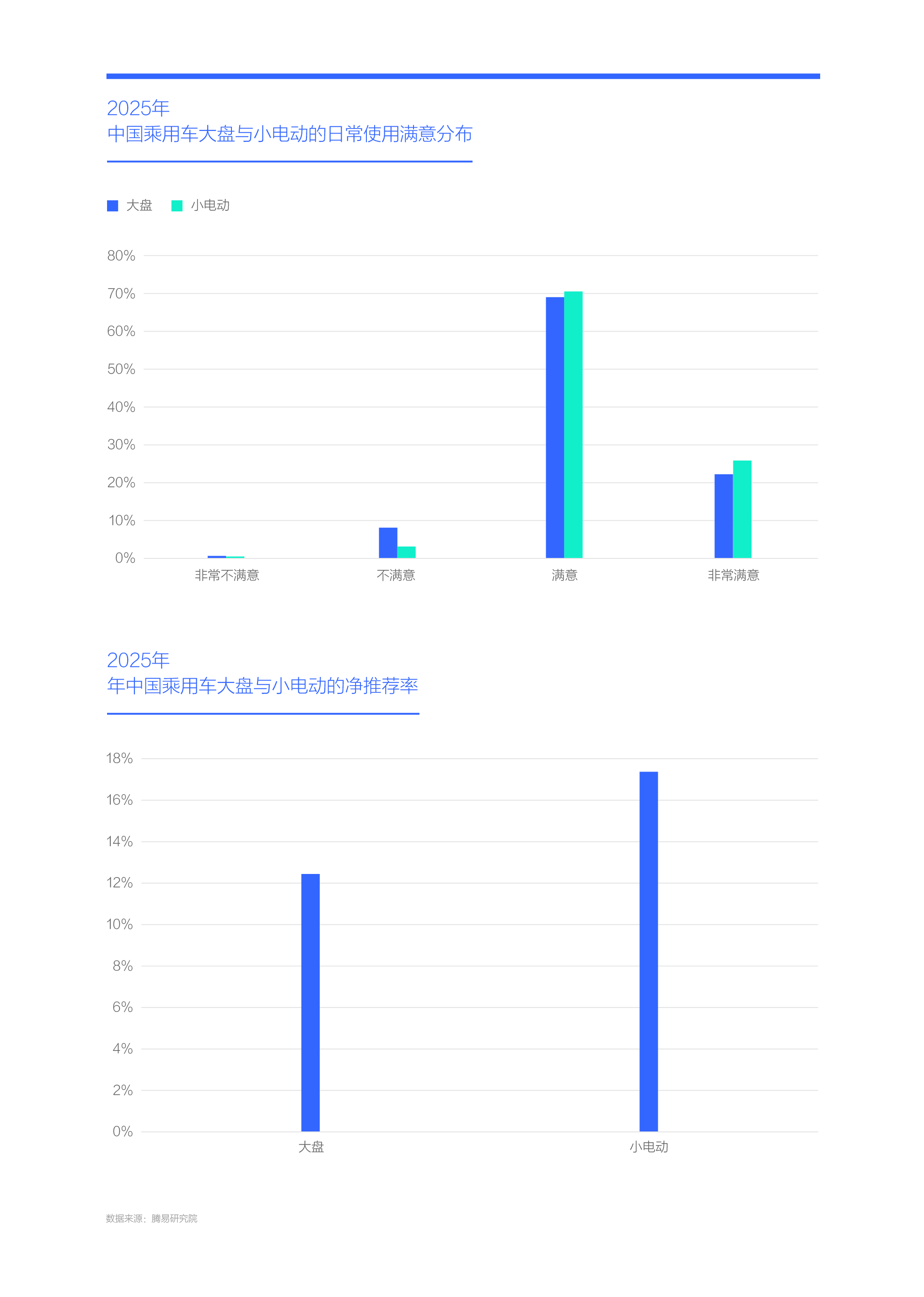 雖然中國(guó)品牌小電動(dòng)仍保持著中國(guó)品牌的便宜傳統(tǒng),但在用料、設(shè)計(jì)、智能等方方面面,都有了大幅提升,甚至形成了優(yōu)勢(shì),自然而然有利于提升用戶口碑與改善品牌形象。2025年中國(guó)乘用車(chē)市場(chǎng)的整體滿意度和非常滿意度分別接近70%和超22%,小電動(dòng)則分別突破70%和接近26%,都高于大盤(pán)水平。2025年中國(guó)乘用車(chē)的整體凈推薦率僅12%多點(diǎn),呈現(xiàn)下滑走勢(shì),小電動(dòng)突破17%,呈現(xiàn)提升走勢(shì)……