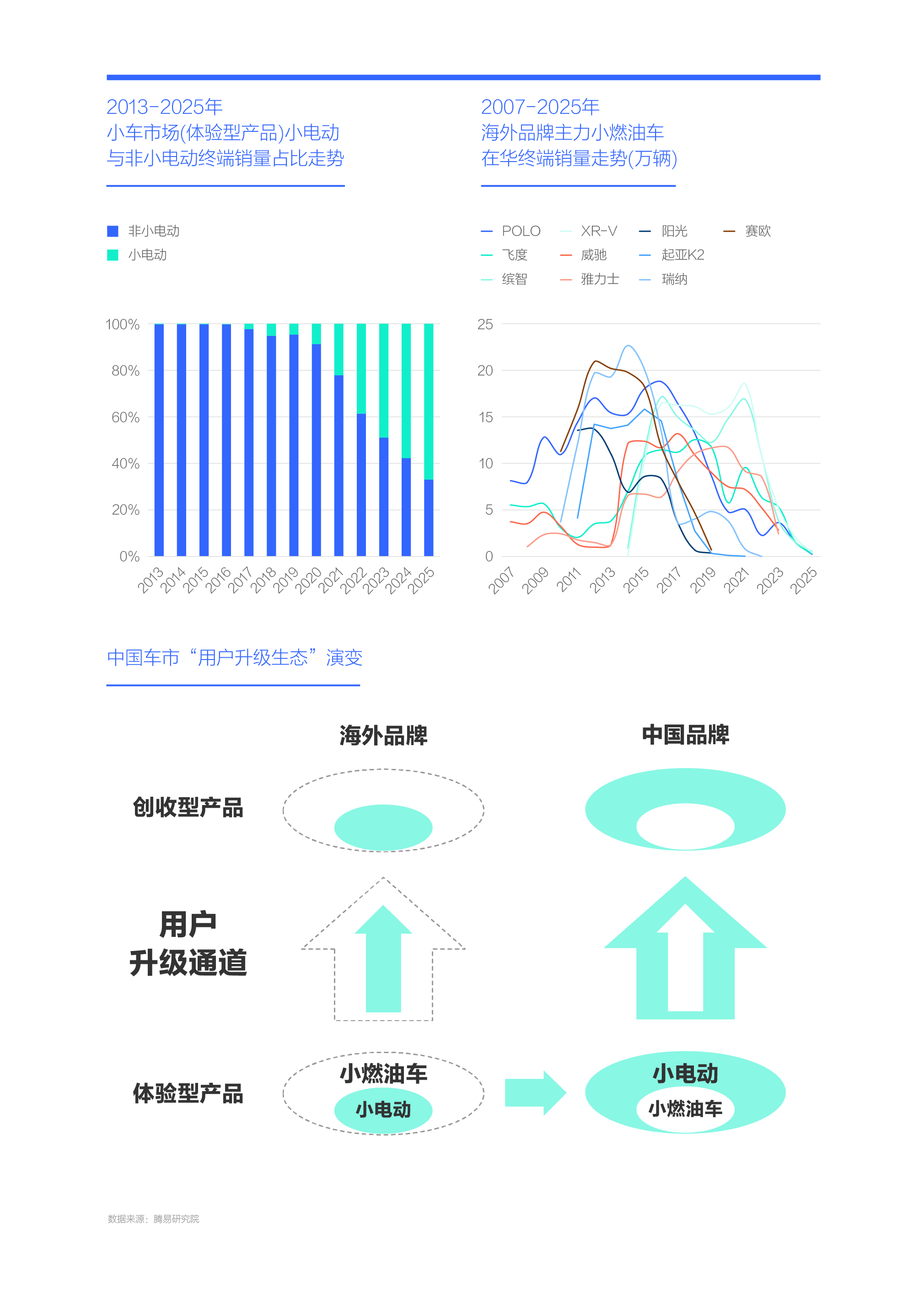 從拓展女性新賽道,到提升口碑,再到策反海外品牌的“他”,小電動(dòng)除為中國(guó)品牌創(chuàng)造增量,還幫中國(guó)品牌重構(gòu)了“用戶升級(jí)生態(tài)”,并順手瓦解了海外品牌基于小燃油車(chē)構(gòu)建的“用戶升級(jí)生態(tài)”。2025年底,POLO、飛度等代表性小燃油車(chē)在華銷(xiāo)量微乎其微,接近停產(chǎn)狀態(tài),一個(gè)時(shí)代幾乎即將畫(huà)上句號(hào);