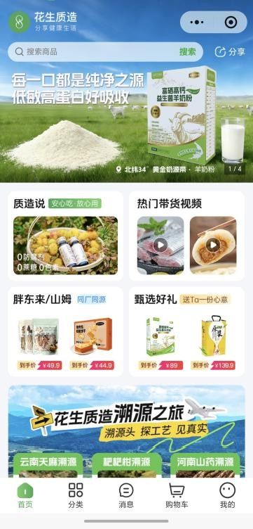 正是基于這樣的強大資源與深厚沉淀,花生質(zhì)造雖是一個“新品牌”,卻帶著一份“厚底氣”,得以在創(chuàng)立之初便迅速打通“私域-公域”流量鏈路,并借助微信小程序這一輕量化載體,實現(xiàn)用戶裂變與傳播提效。這不僅縮短了消費路徑,也便于用戶分享與推廣,逐步構建起品牌自身的IP影響力。
