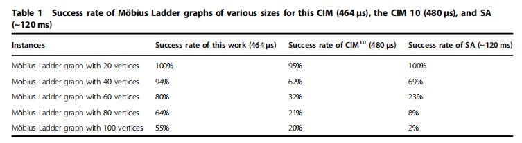 表1:基于CIM(464 μs)、CIM 10(480 μs)及SA(~120ms)計(jì)算不同頂點(diǎn)大小的莫比烏斯梯形圖的成功率