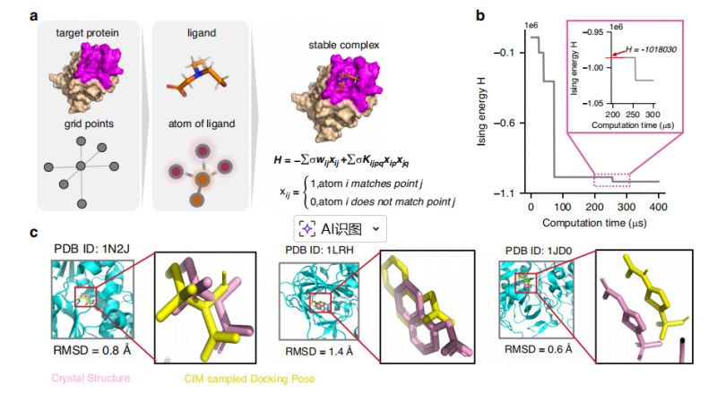c圖:采樣對(duì)接構(gòu)象(黃色)與晶體結(jié)構(gòu)構(gòu)象(粉色)的1N2J、1LRH和1JD0對(duì)比。這三種分子的均方根偏差(mRMSD)值分別為0.8?、1.4?和0.6?,均低于2?,表明相干光量子計(jì)算機(jī)在分子對(duì)接計(jì)算中的有效性。