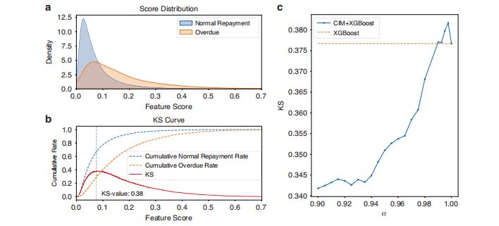c圖:隨著α參數(shù)的增加,量子特征選擇CIM+ XGBoost模型的KS統(tǒng)計(jì)量持續(xù)上升。當(dāng)α值超過(guò)0.99時(shí),該量子特征選擇模型的性能已超越未進(jìn)行特征選擇的XGBoost模型。