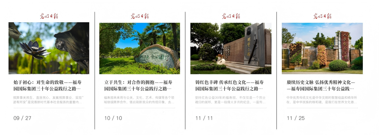 《白皮書》成果的發(fā)布,對福壽園公益事業(yè)做出階段性總結(jié),為集團(tuán)進(jìn)一步構(gòu)建“企業(yè)—行業(yè)—社會”可持續(xù)、常態(tài)化公益體系提供了思路。2025年,光明日報APP、光明網(wǎng)、《文摘報》連續(xù)四期刊登福壽園公益踐行系列報道。這也是中央級媒體首次連續(xù)性、系統(tǒng)化、全景式展示福壽園三十年公益之路。