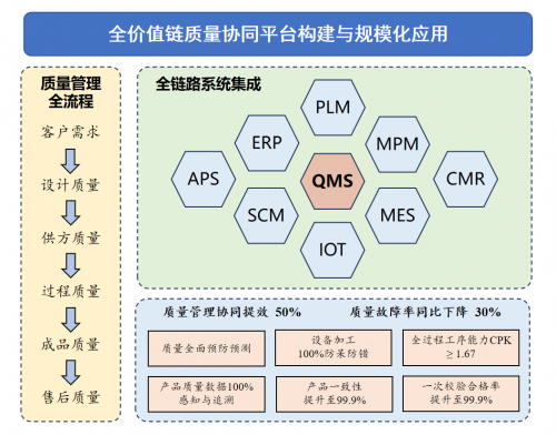 第四,全價(jià)值鏈質(zhì)量協(xié)同平臺(tái)的規(guī)?;瘧?yīng)用。平臺(tái)以質(zhì)量管理系統(tǒng)為核心,無(wú)縫連接企業(yè)內(nèi)部研發(fā)、生產(chǎn)、供應(yīng)鏈及售后服務(wù)等環(huán)節(jié),并延伸至上下游合作伙伴,實(shí)現(xiàn)質(zhì)量信息的實(shí)時(shí)共享與業(yè)務(wù)的協(xié)同優(yōu)化。據(jù)內(nèi)部數(shù)據(jù)顯示,該平臺(tái)的應(yīng)用使質(zhì)量管理協(xié)同提效50%,質(zhì)量故障率同比下降30%,產(chǎn)品一致性提升至99.9%。