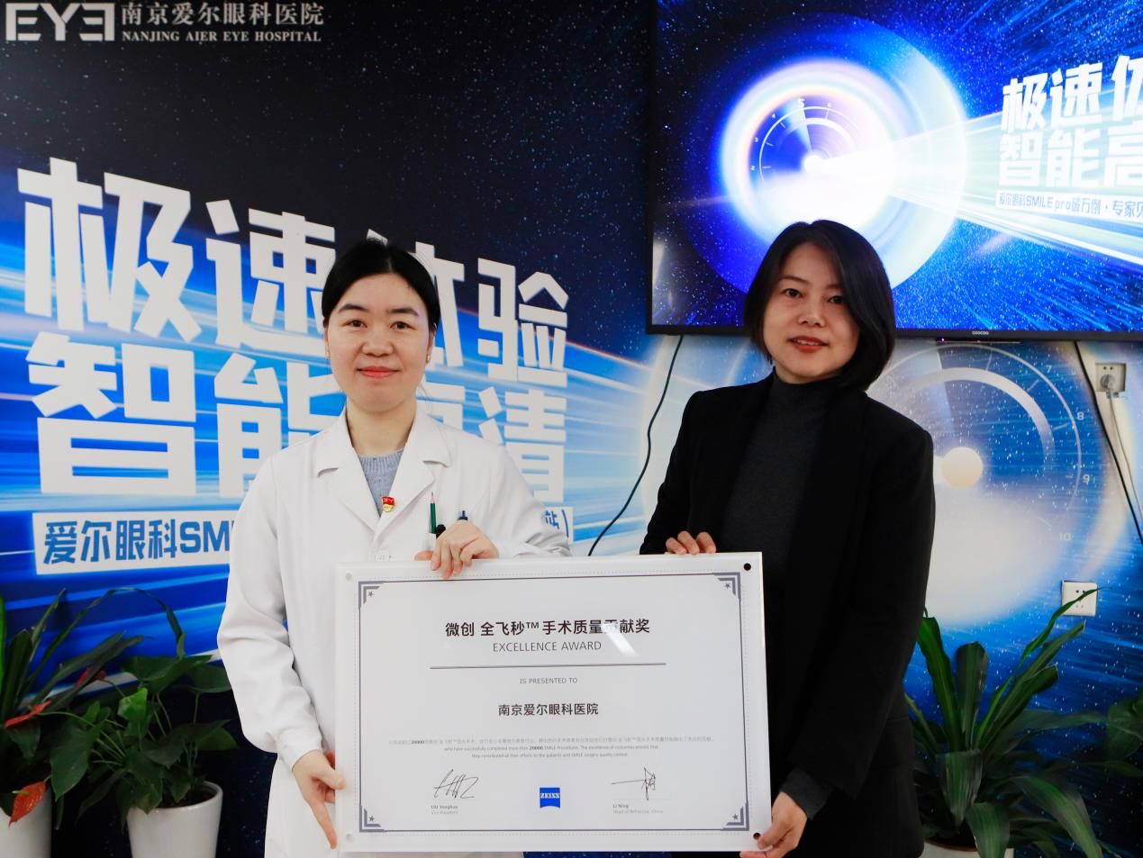 ▲南京愛(ài)爾眼科醫(yī)院屈光手術(shù)科主任熊娟女士接受《南京愛(ài)爾全飛秒破2萬(wàn)例手術(shù)質(zhì)量貢獻(xiàn)獎(jiǎng)》授牌