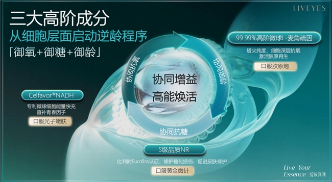 在抗初老的需求日益迫切的背景下,越來越多女性開始把目光從肌膚表層護理,轉(zhuǎn)向從細胞層面養(yǎng)護。LIVEYES?麗維顏逆光瓶,基于細胞深層次抗衰思路而生——針對廣大女性初老高發(fā)階段,從細胞衰老的根源入手,幫助女性由內(nèi)而外煥活年輕態(tài),找回魅力自信。