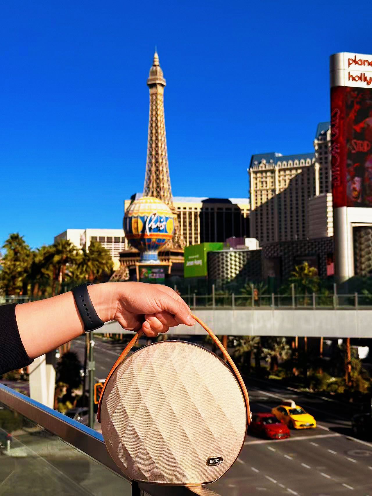 設計上:靈感源自音樂廳穹頂曲線與奢牌圓餅包廓形,一體成型圓潤機身搭配菱格紋聲學網布與意大利進口真皮手提帶,質感媲美萬元包款;