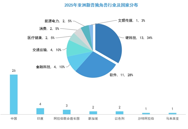 2025年,亞洲新晉39家獨(dú)角獸企業(yè),總估值約為2207.71億美元,平均估值約為56.61億美元。其中硬科技(13家,34%)和軟件(11家,28%)行業(yè)居多,金融科技(4家,10%)以及交通運(yùn)輸(4家,10%)行業(yè)其次,其余為醫(yī)療健康(2家,5%)、消費(fèi)(2家,5%)等行業(yè)。