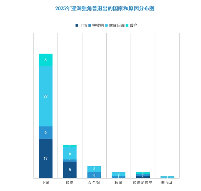 2025年,亞洲獨(dú)角獸退出了89家,主要退出原因包括四大類:上市(28家)、被收購(12家)、估值回調(diào)(41家)和破產(chǎn)(8家)。從總體原因來看,估值回調(diào)是亞洲獨(dú)角獸在2025年退出的主要原因,占比46%;其次是上市,占比31%。從國家分布來看,中國在2025年退出的獨(dú)角獸數(shù)量占比最多,高達(dá)67.4%,共60家,其中,29家估值回調(diào),19家上市。其次是印度,共有16家獨(dú)角獸退出,包括8家上市,6家估值回調(diào)。這也符合亞洲獨(dú)角獸總體的數(shù)量分布。