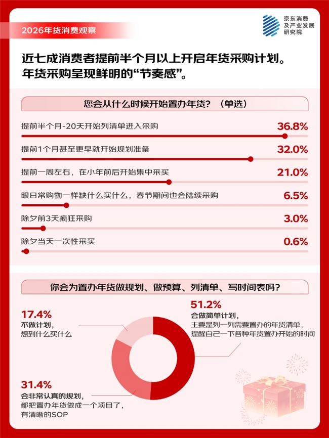 · 不同于日常購物,消費者在年貨采購過程中展現(xiàn)出“強計劃性、高活躍度、禮贈驅(qū)動”的顯著特征。調(diào)研顯示,68.8%的用戶會提前半個月以上開啟年貨采購計劃,還有21%的人會在小年前后開始集中置辦采買年貨,高比例的提前采購行為反映出春節(jié)籌備承載的“儀式感”。同時,年貨消費的計劃性更強,超過八成的消費者(82.6%)會在采購前制定購物計劃,其中的四成消費者屬于“高度計劃者”,他們將年貨置辦視為一個“項目”,做規(guī)劃、做預(yù)算、列清單、定排期……形成清晰的SOP,有節(jié)奏的進行細節(jié)落地。另一組調(diào)研數(shù)據(jù)則顯示,相較于日常購物,超過半數(shù)的消費者在選購年貨時會顯著增加打開購物APP的頻率,“看到合適的商品會先放入購物車”、“會比平時更加關(guān)注禮盒類產(chǎn)品”。