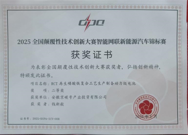 京碳號(hào)與隸屬于國務(wù)院國資委的建筑材料工業(yè)技術(shù)情報(bào)研究所簽署了產(chǎn)學(xué)研一體化的技術(shù)合作協(xié)議,扎根安徽。為發(fā)揮大院大所的科技優(yōu)勢(shì),雙方共建公共研發(fā)技術(shù)平臺(tái),提高循環(huán)工業(yè)的核心競爭力。在此基礎(chǔ)上,雙方歷時(shí)5年基于RCT大宗固廢處理技術(shù),衍生出利用廢舊電池拆解回收提鋰后的磷鐵渣,循環(huán)再生制備再生新能源電池正極前驅(qū)體—磷酸鐵。該技術(shù)生產(chǎn)的的磷酸鐵,在國內(nèi)頭部電池企業(yè)進(jìn)行電池生產(chǎn),裝機(jī)測(cè)試后,效果獲得一致好評(píng)。其關(guān)鍵性指標(biāo)如:磁性物質(zhì)含量、鋁含量、鈦含量基于大宗固廢除雜積累的經(jīng)驗(yàn),突破了行業(yè)關(guān)鍵技術(shù)壁壘。該技術(shù)于25年下半年參與科技部創(chuàng)設(shè)的全國顛覆性技術(shù)創(chuàng)新大賽智能網(wǎng)聯(lián)新能源汽車錦標(biāo)賽,歷時(shí)半年,披荊斬棘獲得全國二等獎(jiǎng)。獲得了行業(yè)專家和頭部企業(yè)的肯定。