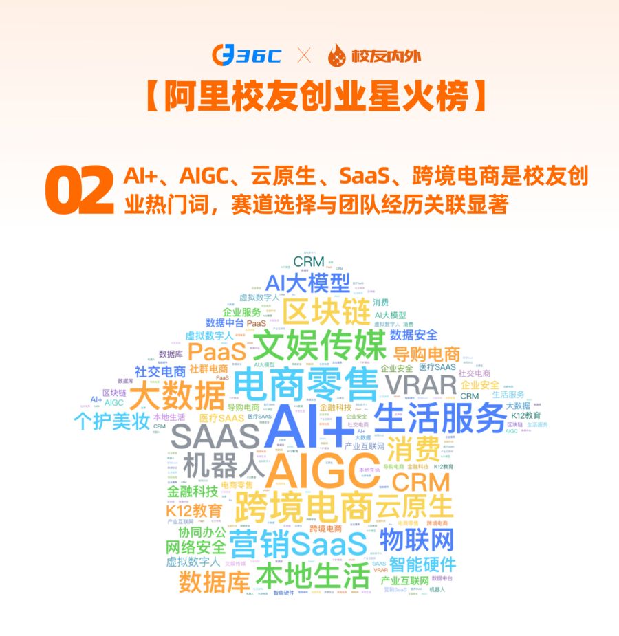 從賽道分布看,AI+、AIGC、云原生、SaaS、跨境電商等領(lǐng)域是創(chuàng)業(yè)熱點(diǎn),這與創(chuàng)業(yè)者在阿里期間從業(yè)經(jīng)歷高度相關(guān)。