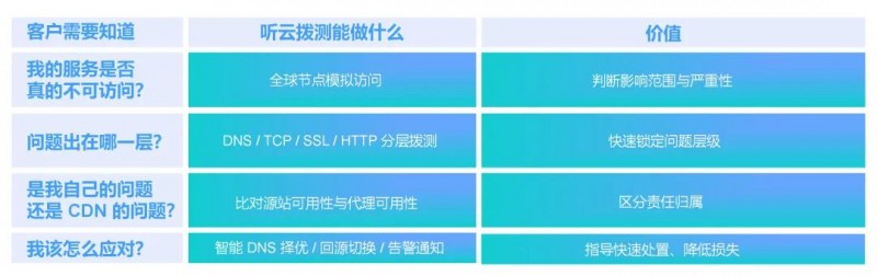 撥測不是替廠商“抓錯”,而是替客戶“還原事實(shí)”,當(dāng) CDN 或云服務(wù)宕機(jī)時(shí),聽云 Network 的撥測體系可以幫企業(yè)在幾分鐘內(nèi)回答這四個關(guān)鍵問題: