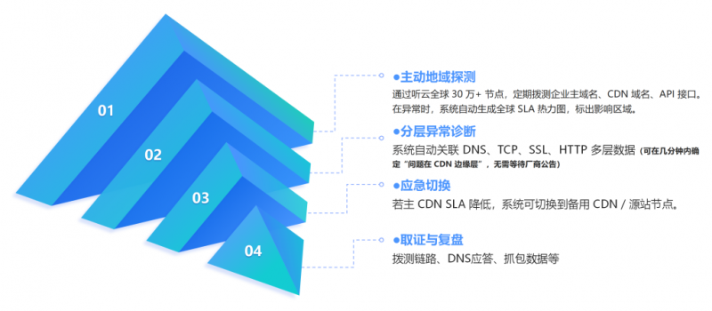 聽云 Network 通過主動地域探測、分層異常診斷、應(yīng)急切換和取證與復(fù)盤,構(gòu)建了從“發(fā)現(xiàn)”到“行動”的四步閉環(huán),幫助客戶建立獨(dú)立的觀測韌性。