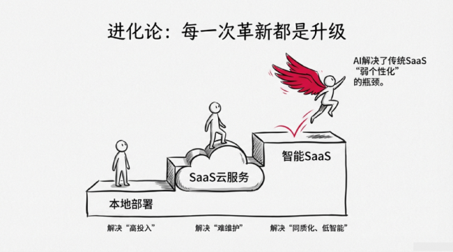 從最早的本地部署軟件,到后來SaaS上云,核心邏輯從來不是“把舊的干掉”,而是“讓好的更好”。以前上云,是為了解決企業(yè)買服務(wù)器、維護系統(tǒng)太麻煩的問題;現(xiàn)在AI來了,是為了解決SaaS“功能同質(zhì)化、不夠聰明、個性化成本高”的難題。