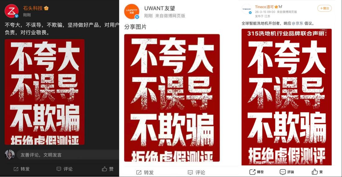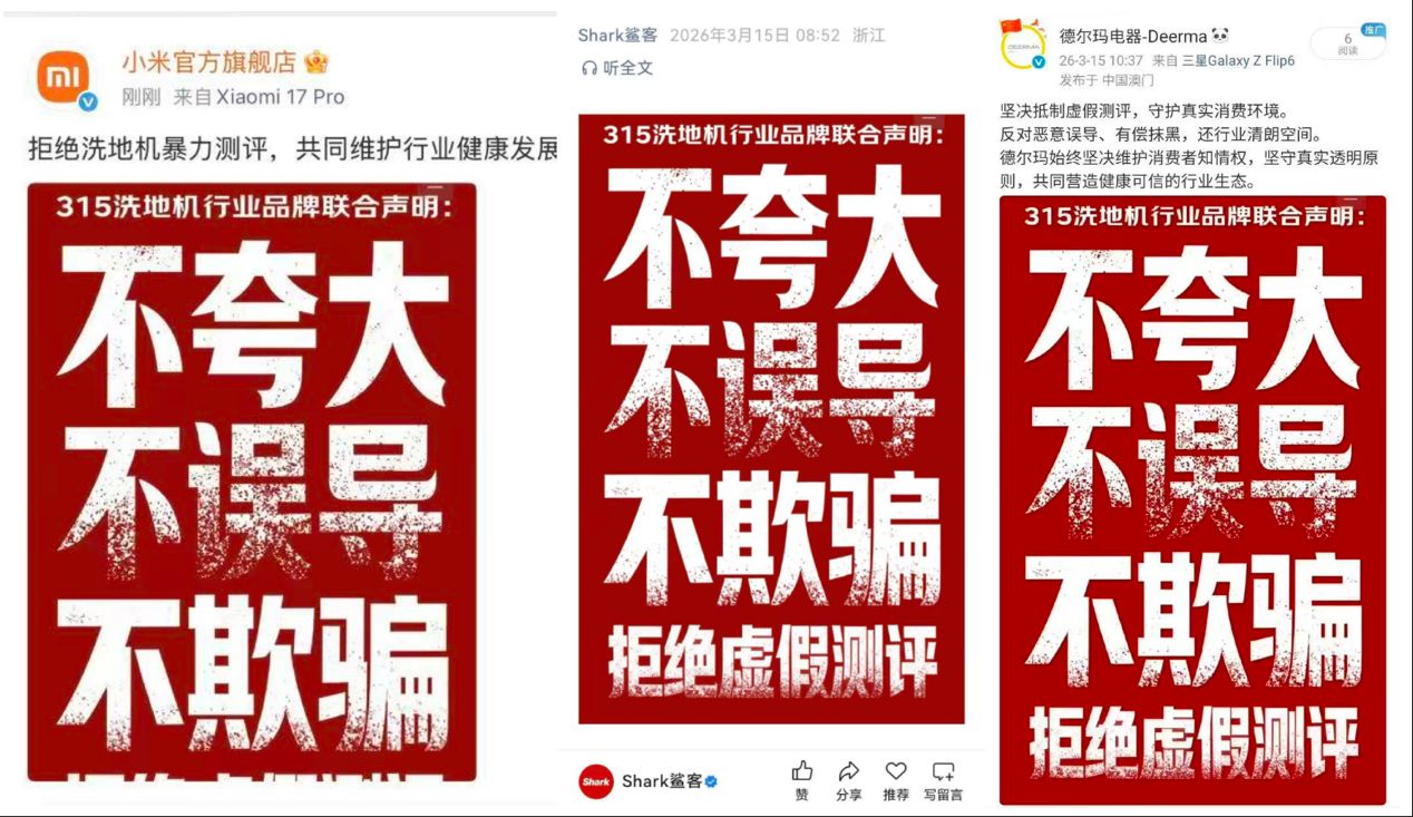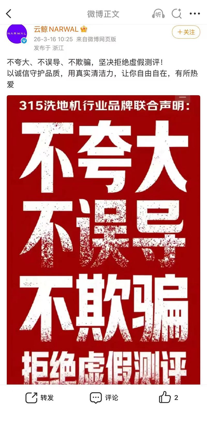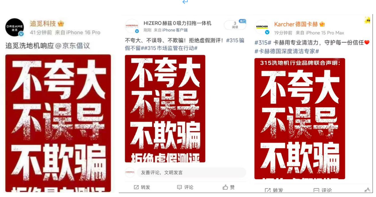 事實上,在近日的2026年AWE展會期間,京東就已聯(lián)合云鯨、添可、追覓、uwant等多家洗地機品牌,在現(xiàn)場揭穿部分直播機構通過“技術處理”制造性能假象的操作方式,共同發(fā)聲抵制虛假測評對行業(yè)生態(tài)的侵蝕。多位品牌負責人更是隔空怒斥虛假直播間。云鯨品牌負責人當場直言:“我們兩三年研發(fā)出的科技成果,被這些虛假直播間用十幾秒就‘否定’了,這不僅是對品牌投入的不尊重,更是在誤導消費者。如果今天不站出來發(fā)聲,消費者就可能一直被蒙在鼓里?!?還有品牌負責人表示,一些直播間會通過人為干預產(chǎn)品結構、堵塞吸污口等方式制造性能下滑假象,這種做法根本不是客觀測評,而是在刻意“變魔術”。