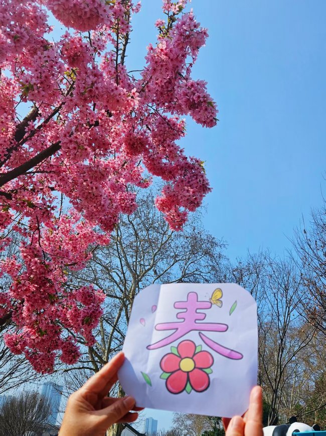 我牽著女兒緩步走進(jìn)花林,她掙脫我的手,鉆進(jìn)花枝間,仰著小臉細(xì)數(shù)花瓣上的紋路,鼻尖幾乎要觸到那抹嬌嫩的粉。陽(yáng)光落在她的發(fā)梢,與飄落的花瓣交織成一幅鮮活的畫面。女兒舉著我提前畫好的 “春” 字手繪,踮起腳尖將它伸向花枝,粉白的花瓣與手繪上的紅花相映,鏡頭里,春天的模樣被永遠(yuǎn)定格。