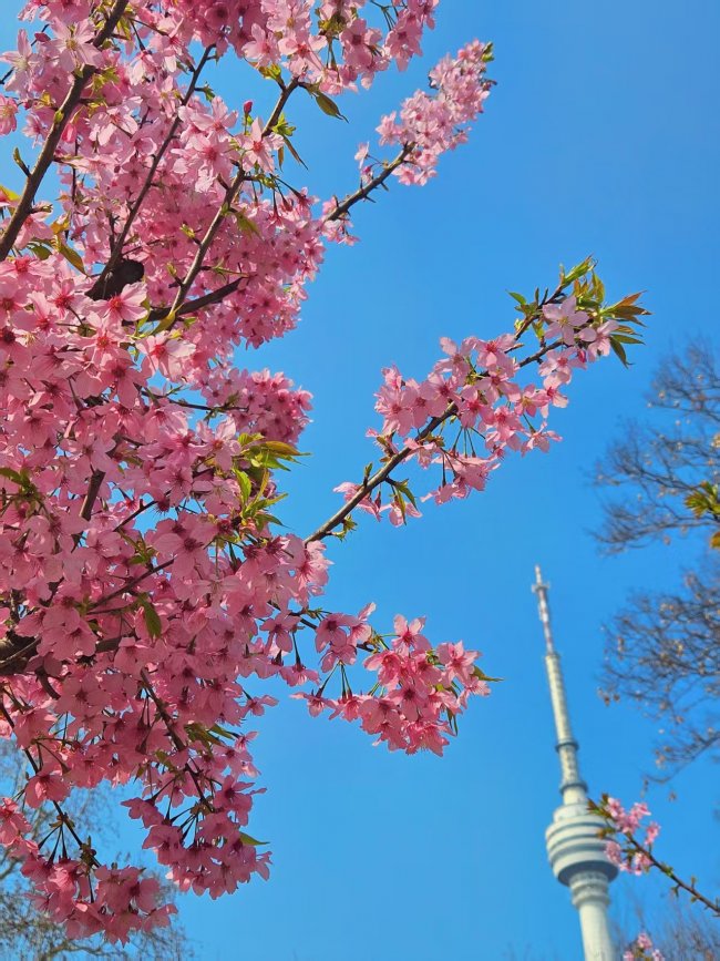 行至山腰,銀灰色的龜山電視塔清晰可見(jiàn),古老的山、新生的花、現(xiàn)代的塔,在春光里和諧共生,像極了武漢這座城市的模樣 —— 既有深厚的歷史底蘊(yùn),又滿是蓬勃的生機(jī)。往來(lái)的游人臉上都帶著笑意,有白發(fā)老人相互攙扶賞花,有年輕情侶花下相擁,也有像我一樣帶著孩子的父母,耐心為孩子講述春日故事。這份簡(jiǎn)單的快樂(lè),在櫻花的映襯下格外動(dòng)人。