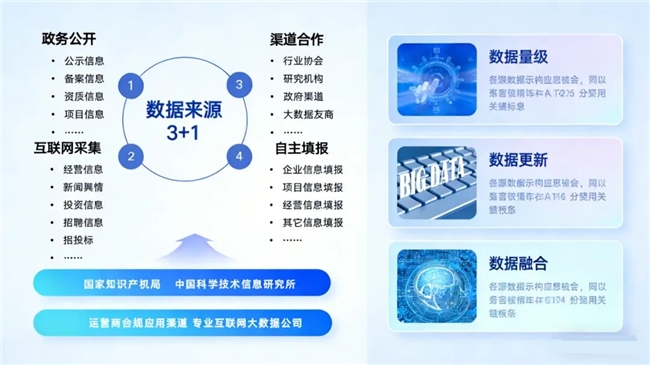 匯聚政務公開、互聯(lián)網(wǎng)采集、合作渠道、企業(yè)自主填報等“3+1”數(shù)據(jù)來源,形成全域融合的數(shù)據(jù)資源池。