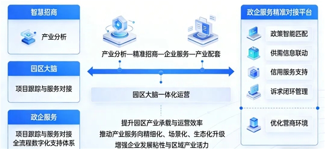 產(chǎn)業(yè)專題智管平臺聚焦智慧招商、園區(qū)大腦、政企服務等場景,構(gòu)建覆蓋產(chǎn)業(yè)分析、項目跟蹤與服務對接的全流程數(shù)字化支持體系,通過園區(qū)大腦一體化運營,打通“產(chǎn)業(yè)分析—精準招商—企業(yè)服務—產(chǎn)業(yè)配套”全鏈條,提升園區(qū)產(chǎn)業(yè)承載與運營效率;同時依托政企服務精準對接平臺,實現(xiàn)政策智能匹配、供需信息聯(lián)動、信用服務支持與訴求閉環(huán)管理,推動產(chǎn)業(yè)服務向精細化、場景化、生態(tài)化方向升級,持續(xù)優(yōu)化營商環(huán)境,增強企業(yè)發(fā)展粘性與區(qū)域產(chǎn)業(yè)活力。