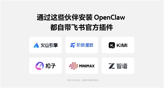面向工程師,飛書(shū)開(kāi)源并持續(xù)升級(jí)官方 OpenClaw 插件。該插件支持 OpenClaw 以用戶身份操作云文檔、多維表格及日程,實(shí)現(xiàn)與飛書(shū)工作流的深度融合。目前,火山引擎、階躍星辰、Kimi、扣子、MiniMax、智譜等主流大模型與云服務(wù)廠商均已完成與飛書(shū)官方插件的對(duì)接。
