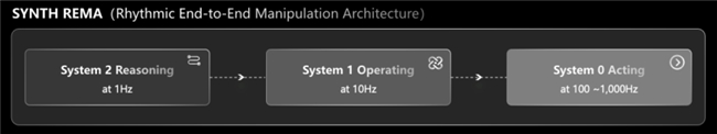 深思·執(zhí)行(SYNAction):面向操作智能的專屬模型架構(gòu),章魚動力首創(chuàng)REMA分頻多尺度端到端操作架構(gòu),在統(tǒng)一模型中通過三層閉環(huán)完成從認知到執(zhí)行:System 2(低頻)負責任務理解、認知推理與高層規(guī)劃,System 1(中頻)負責動作策略生成、銜接認知與執(zhí)行,System 0(高頻)負責底層控制與精細交互執(zhí)行,助力機器人高效完成復雜操作、實現(xiàn)全流程執(zhí)行閉環(huán)。