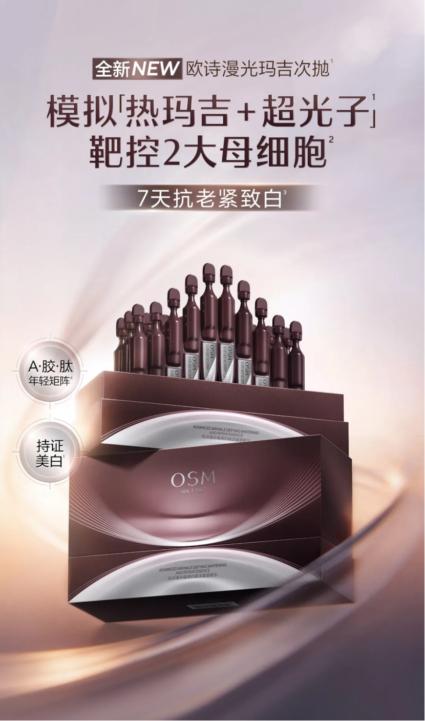 與此同時,歐詩漫自主研發(fā)體系的最新成果——「光瑪吉」次拋精華也于近日重磅上市。作為該品牌首款院線級美白抗老精華,這款產(chǎn)品是歐詩漫在美白、抗老兩大核心賽道研發(fā)成果的集大成之作。