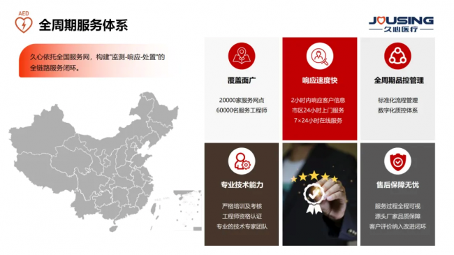 久心醫(yī)療以“監(jiān)測預(yù)警 - 快速響應(yīng) - 專業(yè)處置”為核心,打造全周期服務(wù)閉環(huán),覆蓋設(shè)備部署、運(yùn)維管理、技術(shù)支持、標(biāo)準(zhǔn)化品控全流程,保障緊急場景下快速響應(yīng)。目前,久心 AED 裝機(jī)量近 10 萬臺,覆蓋全國各省市,服務(wù)場景涵蓋北京冬奧會、故宮博物院等國家級重點(diǎn)項(xiàng)目,同時(shí)成功開拓歐洲、東南亞、北非及南美市場,以 “中國智造” 實(shí)力獲得國際市場廣泛認(rèn)可。