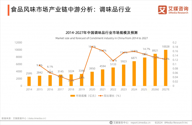 iiMedia Research(艾媒咨詢)發(fā)布的《2025-2026年中國(guó)食品風(fēng)味市場(chǎng)與消費(fèi)趨勢(shì)研究報(bào)告》數(shù)據(jù)顯示,2025年中國(guó)調(diào)味品市場(chǎng)規(guī)模達(dá)到7881億元,同比增長(zhǎng)14.7%,預(yù)計(jì)2027年市場(chǎng)規(guī)模突破萬(wàn)億元。人們對(duì)于美味的追求,驅(qū)動(dòng)著調(diào)味品市場(chǎng)不斷升級(jí)。