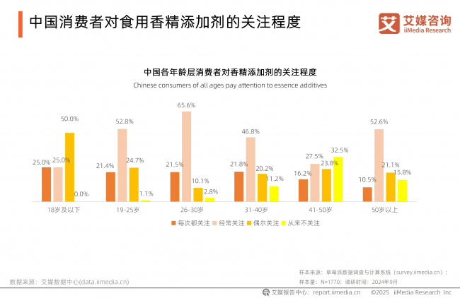 各年齡層的消費(fèi)者均對(duì)食品香精添加劑的關(guān)注度較高,其中26-30歲人群最為關(guān)注。隨著國(guó)內(nèi)消費(fèi)者食品安全意識(shí)的提高,消費(fèi)者如今已十分關(guān)注食品中的各類香精添加劑。僅僅“吃得美味”已無(wú)法滿足當(dāng)代消費(fèi)者的需求,人們更希望“吃得放心、吃得自在”。
