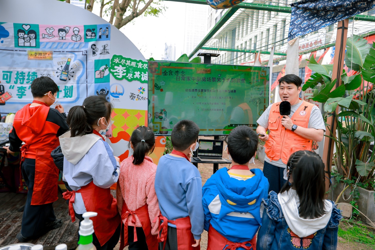 圖:李錦記希望廚師王成浩(上)和志愿者向孩子們科普廚房中的水節(jié)約和全食概念